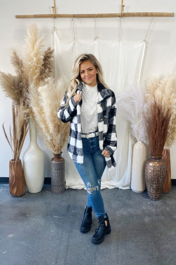 A classic flannel jacket paired with ripped jeans and combat boots creates an effortlessly cool look. This outfit is perfect for a day of exploring or running errands, offering both comfort and style. The monochromatic flannel pattern adds a touch of grunge, while the light-colored top keeps the look fresh and clean. This versatile outfit can easily transition from day to night, making it a staple for any fall wardrobe.