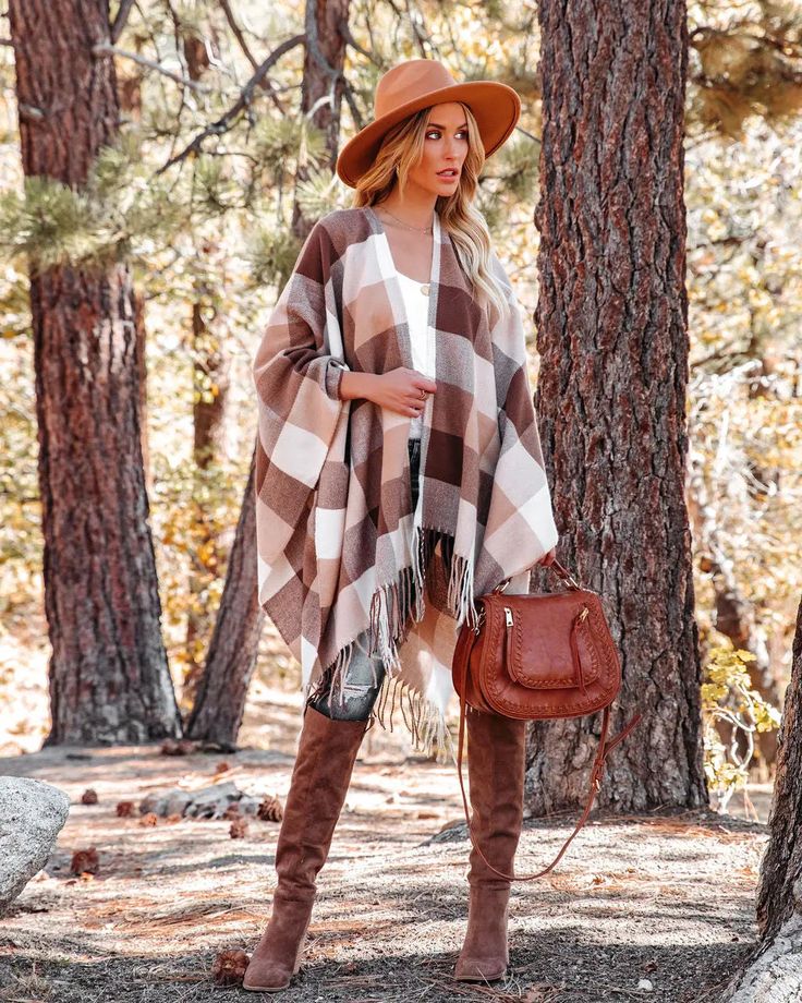 Plaid is a quintessential pattern for fall, and this outfit captures its charm perfectly. A plaid poncho with fringe detailing, paired with over-the-knee boots and a wide-brimmed hat, creates a chic yet cozy look. The warm tones in the plaid poncho are perfect for the season, and the fringe adds a playful touch. This ensemble is ideal for a day at the pumpkin patch or a cozy outdoor party. The addition of tall boots not only keeps you warm but also adds a stylish edge to the outfit.