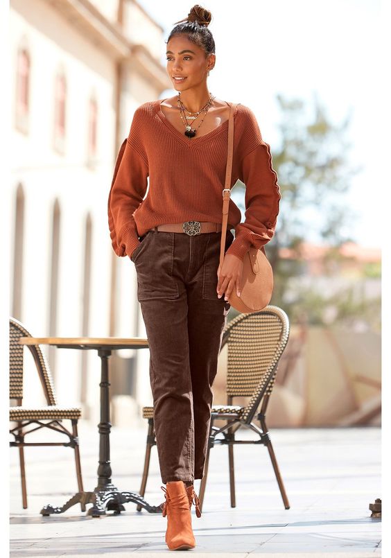 This cozy outfit is perfect for those cool fall days. The rust-colored sweater paired with brown pants creates a warm and coordinated look. The sweater’s loose fit adds comfort, while the pants’ structured design adds a professional touch. This outfit is great for a teacher who needs to stay warm without sacrificing style.