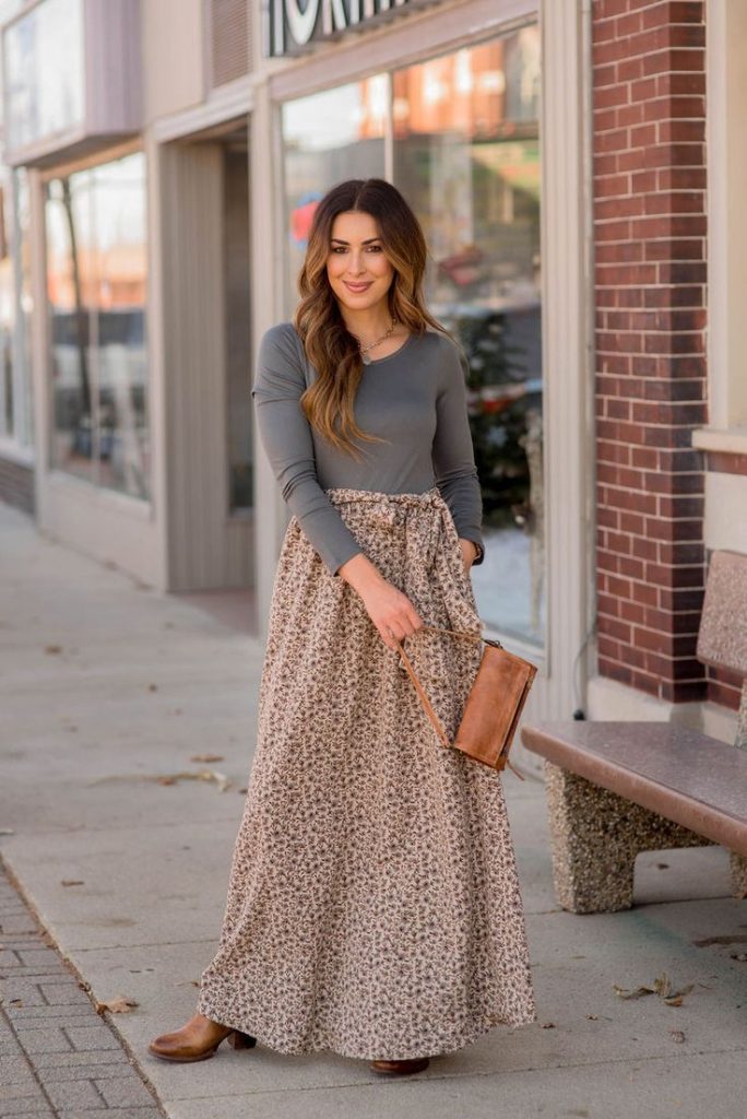 This modern maxi dress is a great choice for fall. The long-sleeved dress with a floral pattern is both elegant and comfortable. The dress’s design is perfect for moving around the classroom while still looking polished. This outfit is great for teachers who prefer a one-piece solution to their wardrobe needs.