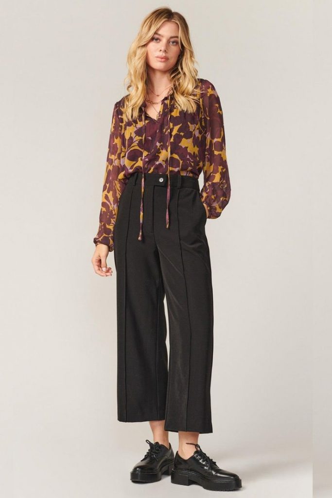 This outfit is for the teacher who isn’t afraid to stand out. The vibrant patterned blouse paired with black wide-leg trousers makes a bold statement. The combination of colors and patterns is eye-catching and fun, perfect for engaging with students. Black platform shoes add a modern touch, making this look both fashionable and functional.