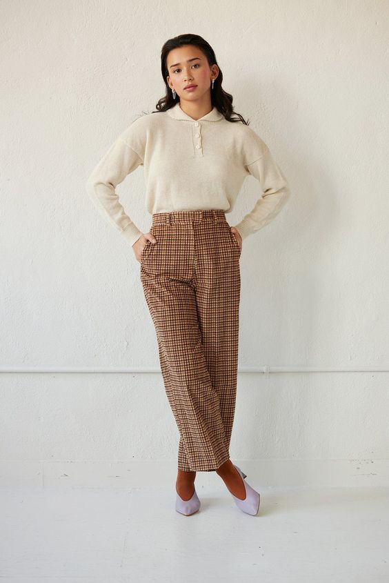 For those who prefer a more classic approach, this outfit is a winner. The cream sweater paired with plaid high-waisted pants is a timeless combination. The sweater provides warmth, while the high-waisted pants offer a flattering fit. This look is perfect for a cozy, casual day of teaching. Pair it with simple flats or loafers to keep it comfortable yet chic.