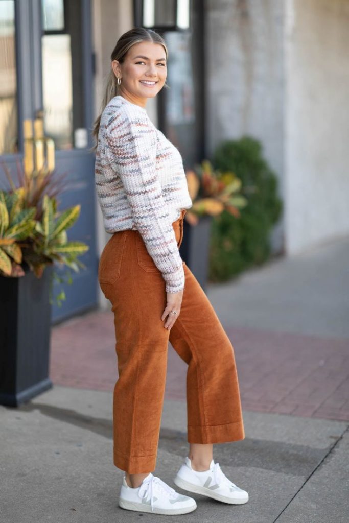 This outfit is a great example of how to stay casual yet chic. The cropped sweater in a colorful pattern paired with rust-colored corduroy pants is a perfect fall combination. The pants are comfortable and durable, making them ideal for a busy day of teaching. White sneakers add a casual touch, perfect for teachers who are on their feet all day.