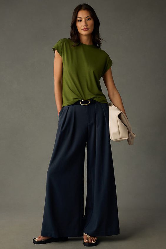 Effortless elegance is the theme of this outfit. The green top paired with navy wide-leg pants creates a clean and sophisticated look. The simplicity of the design makes it easy to accessorize, allowing for versatility in styling. This ensemble is perfect for a teacher who values both comfort and style.