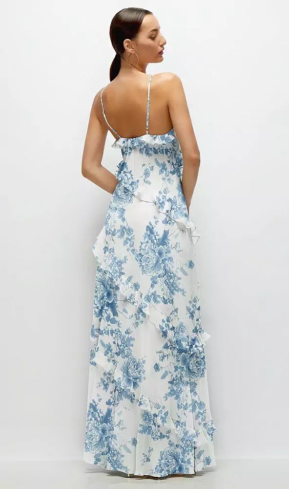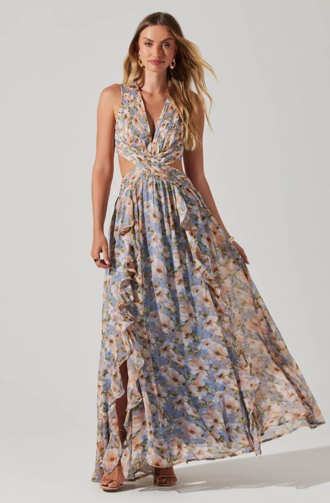 This flowy blue floral maxi dress with cascading ruffles and cutout details embodies modern elegance. The soft chiffon fabric moves effortlessly, making it ideal for summer events or destination weddings. The deep V-neckline and cinched waist create a flattering silhouette, perfect for those who love a feminine yet bold aesthetic.