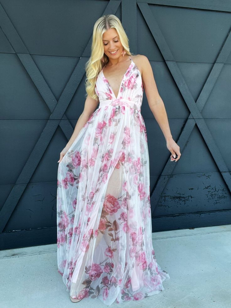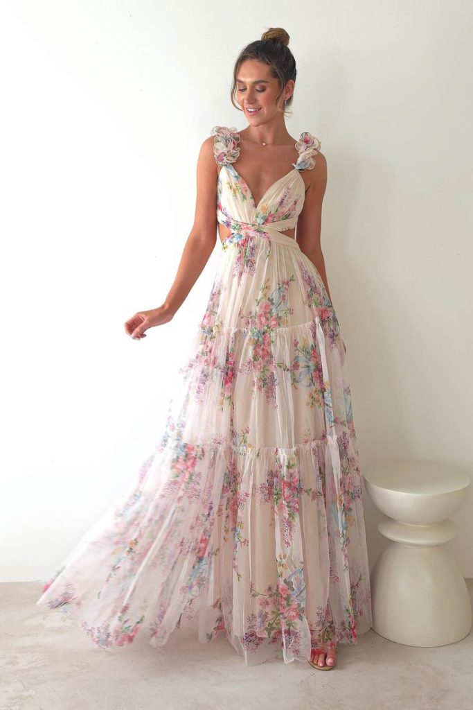 Soft layers of tulle adorned with delicate pastel florals create an enchanting fairy-tale moment. This pink floral maxi dress is perfect for wedding guest attire or romantic evening soirées. The deep V-neckline and adjustable straps enhance the feminine silhouette, while the voluminous skirt ensures an effortlessly regal appearance.