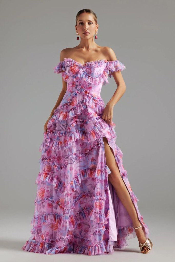 This purple off-the-shoulder floral maxi dress is a showstopper. Designed with cascading ruffles and intricate floral patterns, it blends classic femininity with modern drama. The structured bodice enhances the silhouette, while the daring thigh-high slit adds movement and allure. Ideal for evening events and wedding guest attire, this dress is a statement in itself.
