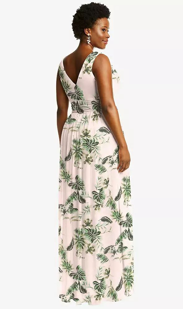 This white maxi dress with green tropical floral prints is a modern take on summer elegance. The deep V-back detail adds an unexpected charm, making it an excellent choice for resort vacations or wedding guest attire. The chiffon fabric ensures breathability, keeping you comfortable yet stylish.