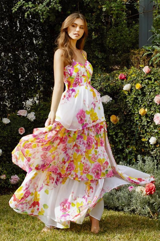 This tiered aesthetic dress is a dream for lovers of spring florals. With layers of airy tulle, it creates a whimsical, romantic effect perfect for weddings, garden parties, or casual springtime brunches. The vibrant mix of pink and yellow blooms adds a playful charm that suits both summer and spring occasions.