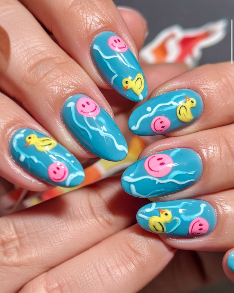 An exciting, seductive gel nail set that brings vibrant charm to any nail style. The nails feature a blue base colored like pool water next to floating pink smiley faces above rubber duck shapes resting on round almond-shaped tips. White decorative swirls tie it all together, giving the nails a buoyant look that matches the summer feeling. The look features retro elements that are perfect for beachwear and vibrant swimwear styles. Design 2025 is characterized by its cute look and charming elements combined with a lighthearted aesthetic.