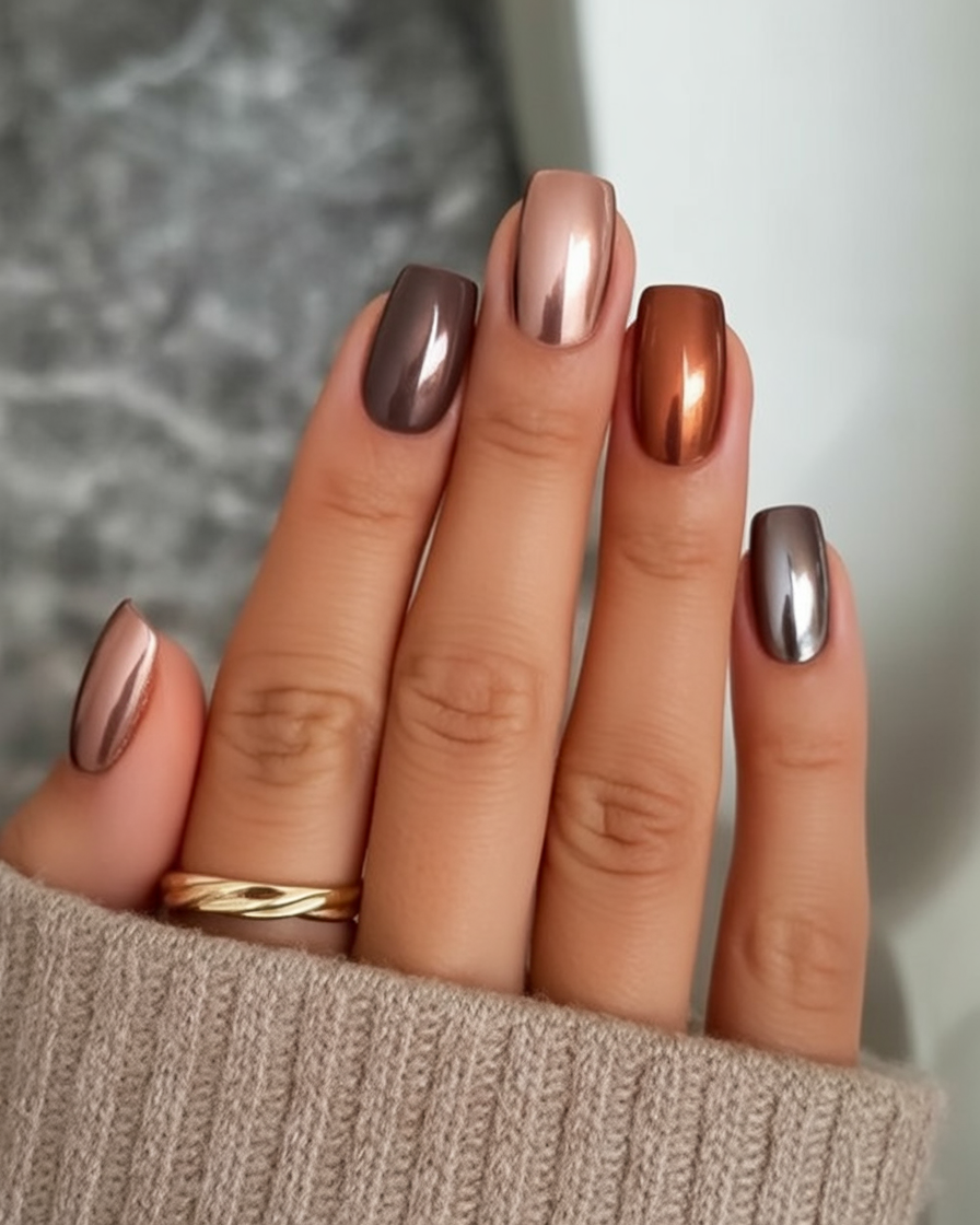 Like a curated stack of jewelry, these mirror-finish squares blend cool silver, warm copper, and rose tones for a sleek, modern result. The chrome shine feels festive without being literal glitter—just pure, polished light. It’s a confident choice for work and weekends alike, and it photographs beautifully with knits and gold rings. If you love neutrals but want impact, this metallic mix is your shortcut to looking put-together with zero fuss.