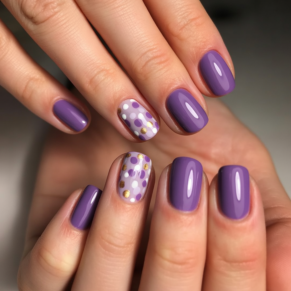 Glossy violet nails get a party-ready accent: playful dots in white and lavender with specks of gold that twinkle when you move. The vibe is upbeat and creative, perfect for birthday dinners or a summer rooftop. It’s bright but wearable, and the rounded square shape keeps everything polished rather than loud.