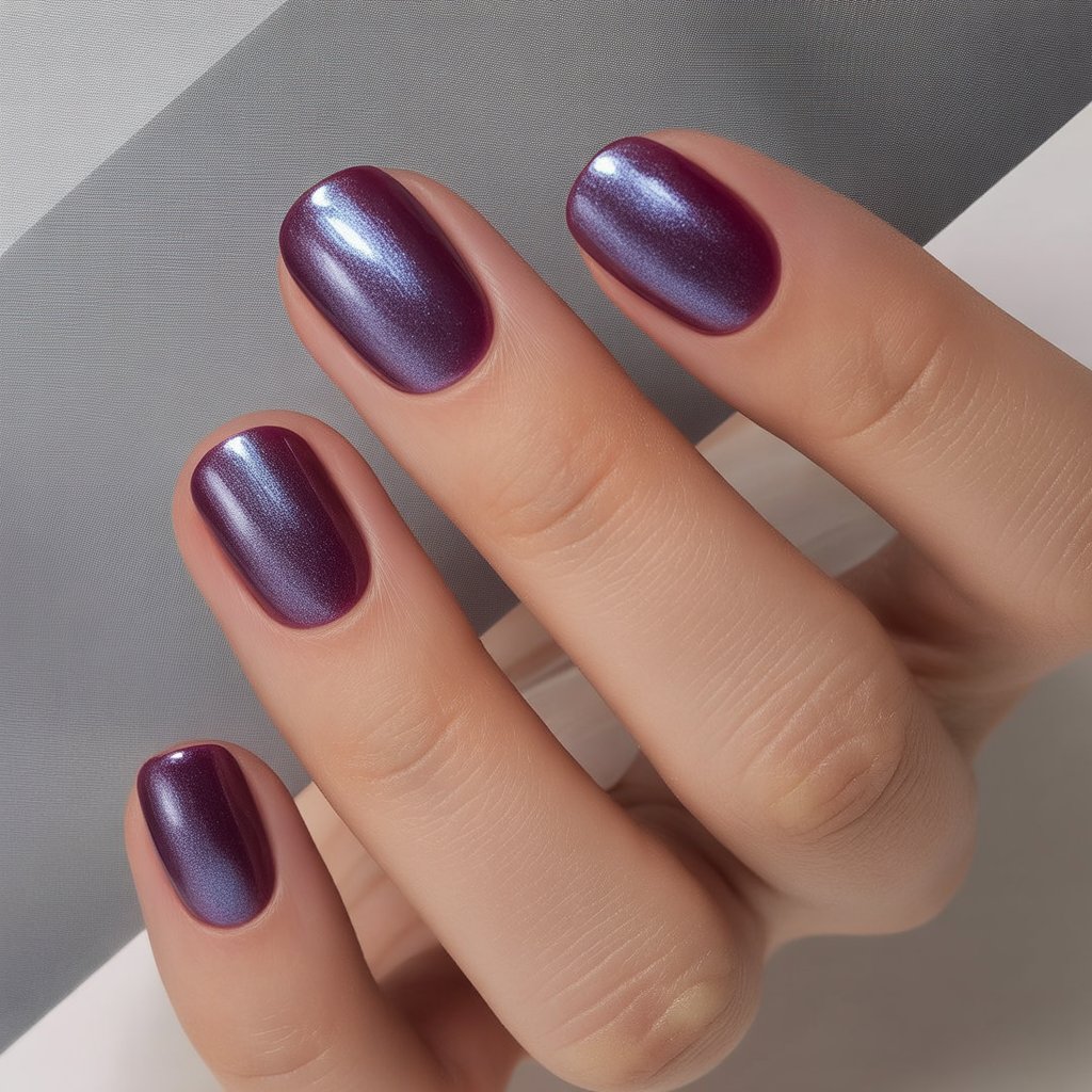 There’s something quietly powerful about this plum gel with a cool steel sheen that shifts as you move. The magnetic glow catches the light like satin, giving even simple oval nails a dressed-up finish. It whispers evening elegance without needing glitter, perfect for dinner plans or a gallery opening. The color walks the line between romantic and modern, making it a beautiful choice if you like polish that flatters everything from denim to silk.