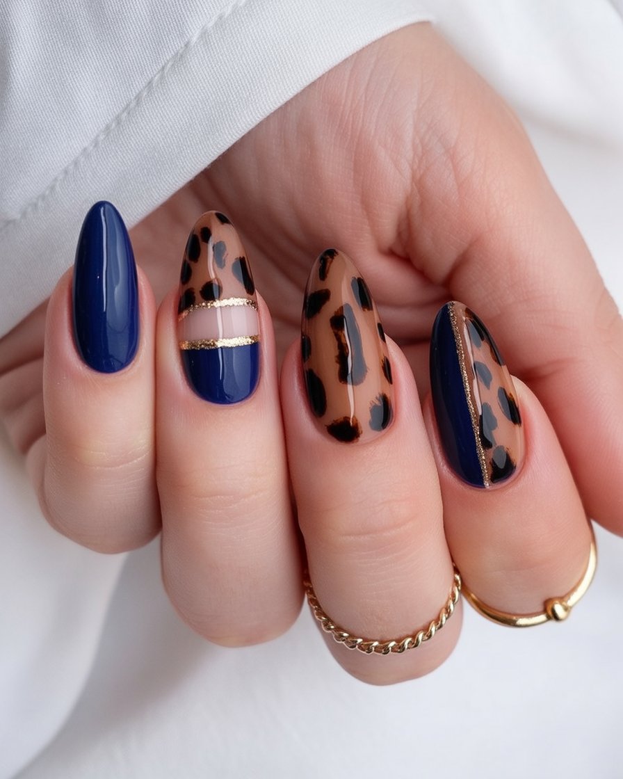 Deep navy meets soft leopard and a whisper of gold striping for a manicure that feels tailored and rich. The interplay of solid color and semi-sheer pattern is intentional, giving almond nails elegant length. It’s the perfect companion to trench coats, leather boots, and a glass of red—balanced, confident, and a touch playful. If you like statement nails that still read “grown-up,” this combo is your sweet spot.