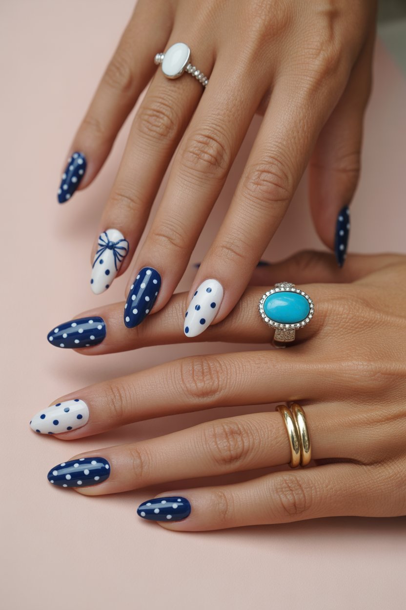 Comparison with other cuts—solid color can feel flat, while alternating dots create movement without clutter. Start with a rubber base, alternate blue and white nails, and dot with a tiny brush for even spacing. Add the bow on one nail to keep focus. Finish with a durable top so the art stays crisp. For a dark skin tone, the navy reads rich and luxurious; on fair skin, it looks nautical and bright.