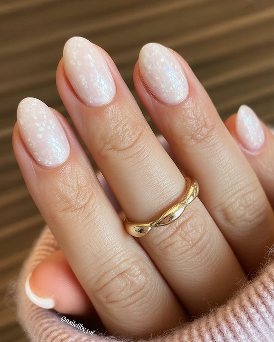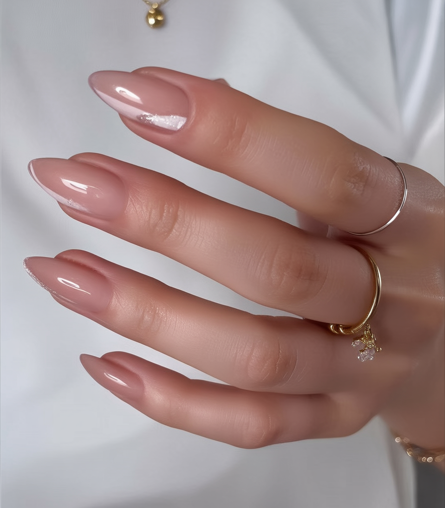 Barely-there nude elongates the nail while a sliver of icy shimmer kisses the tips—a whisper of starlight on a clear night. The finish looks expensive without trying, the kind of manicure that works for weddings, work trips, or Sunday brunch. It’s simple, elegant, and softly glowing under every light source.
