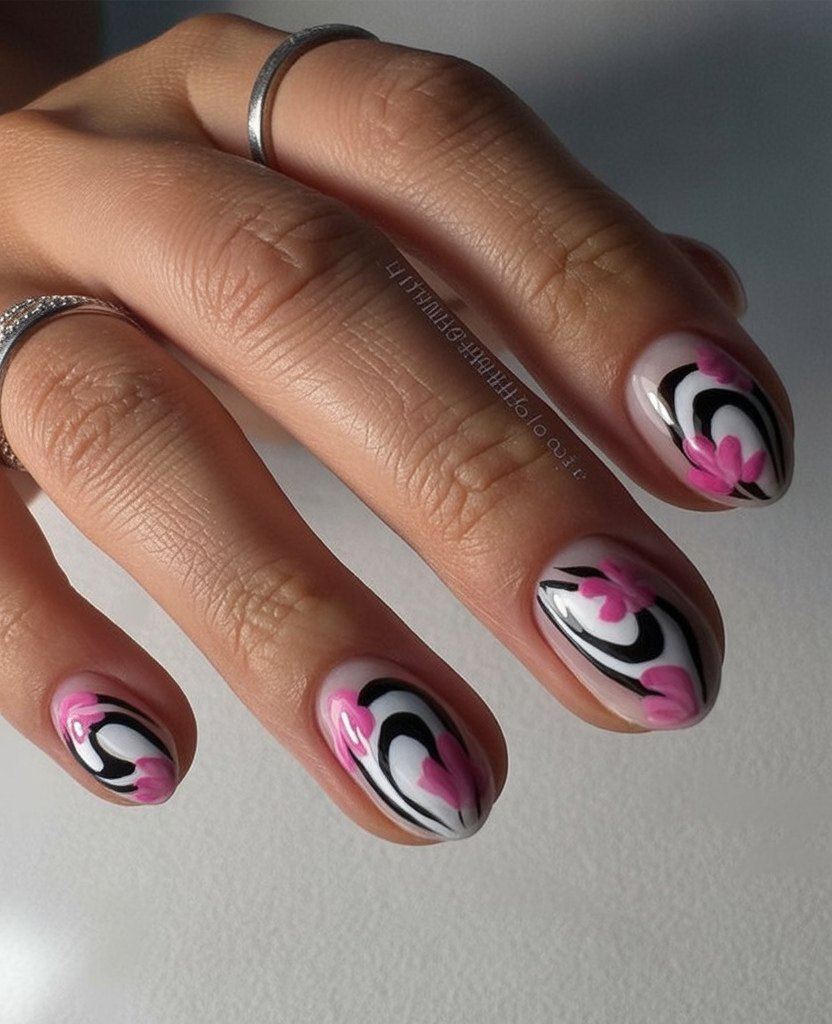 This playful gel set mixes soft white with graphic black curves and pops of pink petals, like a tiny bouquet caught in motion. The design feels modern yet romantic, letting the curved lines elongate short nails while the blooming petals add a lovely, feminine wink. It’s the kind of manicure that lifts your mood on a busy week—fresh, a touch artsy, and still polished enough for the office or a date night. Think of it as wearable art, where the swirls guide the eye and the rosy accents keep everything light and adorable.