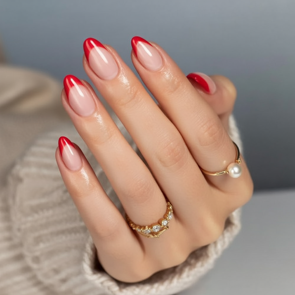 A modern French where vivid red traces the almond tip like lipstick on a smile—sleek, feminine, and a little flirty. The nude base keeps everything airy, while the curved outline sharpens the silhouette for instant elegance. It’s the perfect date-night manicure that still reads boardroom-ready, a timeless balance of warmth and precision you’ll reach for again and again through fall and spring.