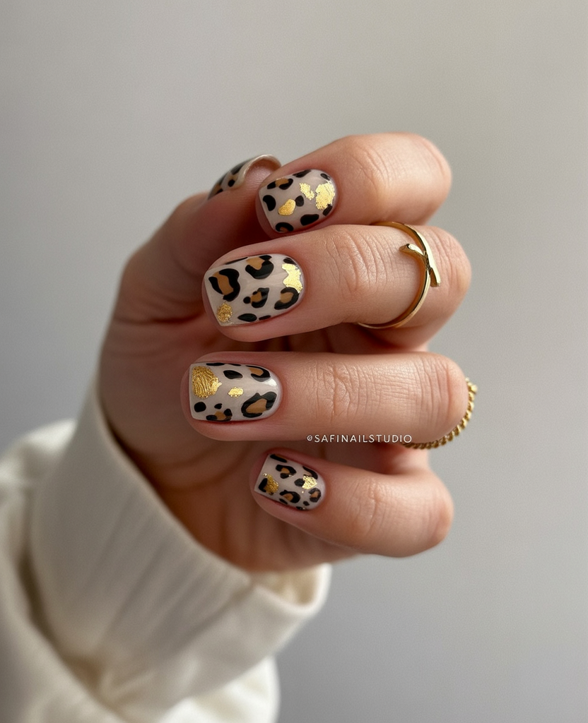 Short neutral nails go couture with soft leopard spots and flashes of gold leaf. The translucent beige keeps it sophisticated, while the metallic flecks act like fine jewelry. It’s the kind of art that works from office to cocktails, pairing as easily with a blazer as it does with a slip dress. Under warm light, the gold glows beautifully.
