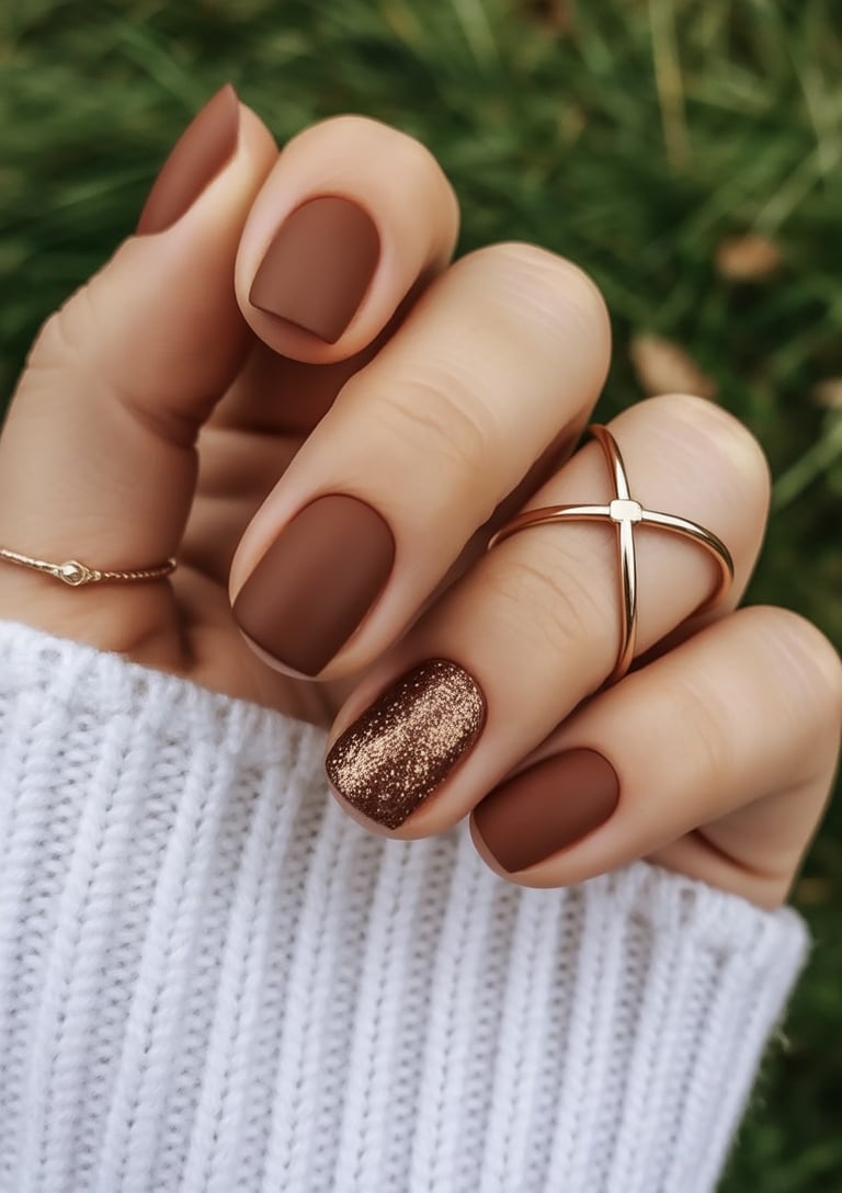 Low maintenance. Matte topcoats have come a long way. Over a BIAB or builder base, they are quite durable. Start with a rubber base for flexibility, then two thin coats of mocha with one accent nail in micro-glitter. Hydrated cuticles complete the look. Touch-ups are a cinch; just lightly buff the accent and re-top, and the sparkle is restored. It is the perfect option for busy weeks and when nail length is short.
