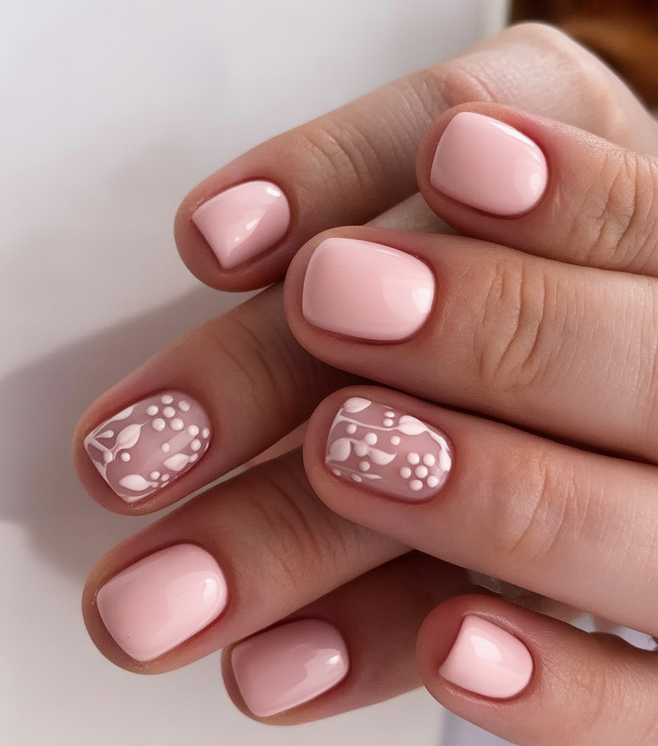 Soft blush gel turns short square nails into tiny porcelain tiles, fresh and polished for everyday wear. Two accent nails pick up a whisper of art with white leaves and dotted berries, creating a gentle rhythm across the hand. It’s sweet without being precious—the kind of manicure that slips from coffee run to dinner date and still looks clean. Think spring walks, knit cardigans, and a little glow on the cheeks; this set is simple, natural, and quietly pretty.