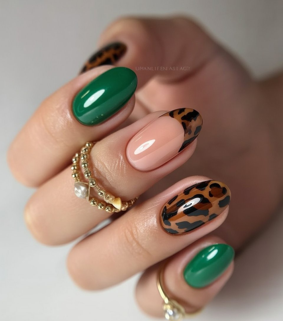 Rich blue-green meets chic leopard in a manicure that feels luxurious without trying too hard. The glossy emerald nails bring instant confidence, while the sheer nude nails capped with a subtle French leopard tip flirt with contrast. It’s polished, a bit wild, and perfect for fall brunches or a night out—think classic jewelry, a camel coat, and that effortless “I’ve got this” vibe. The balance of solid color and design ideas keeps the look modern and not overdone.