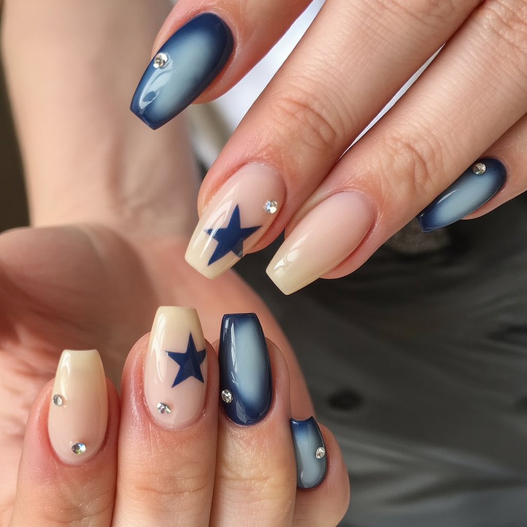 This look mixes a sheer nude base with deep blue ombré and crisp star decals, finished with tiny crystals that catch the light. It’s playful but polished—like your favorite bomber jacket styled with pearls. The gradient keeps the eye moving while the stars add a wink of inspiration. Wear it to summer concerts or Fourth of July weekend barbecues, and it still feels chic at the office on Monday.