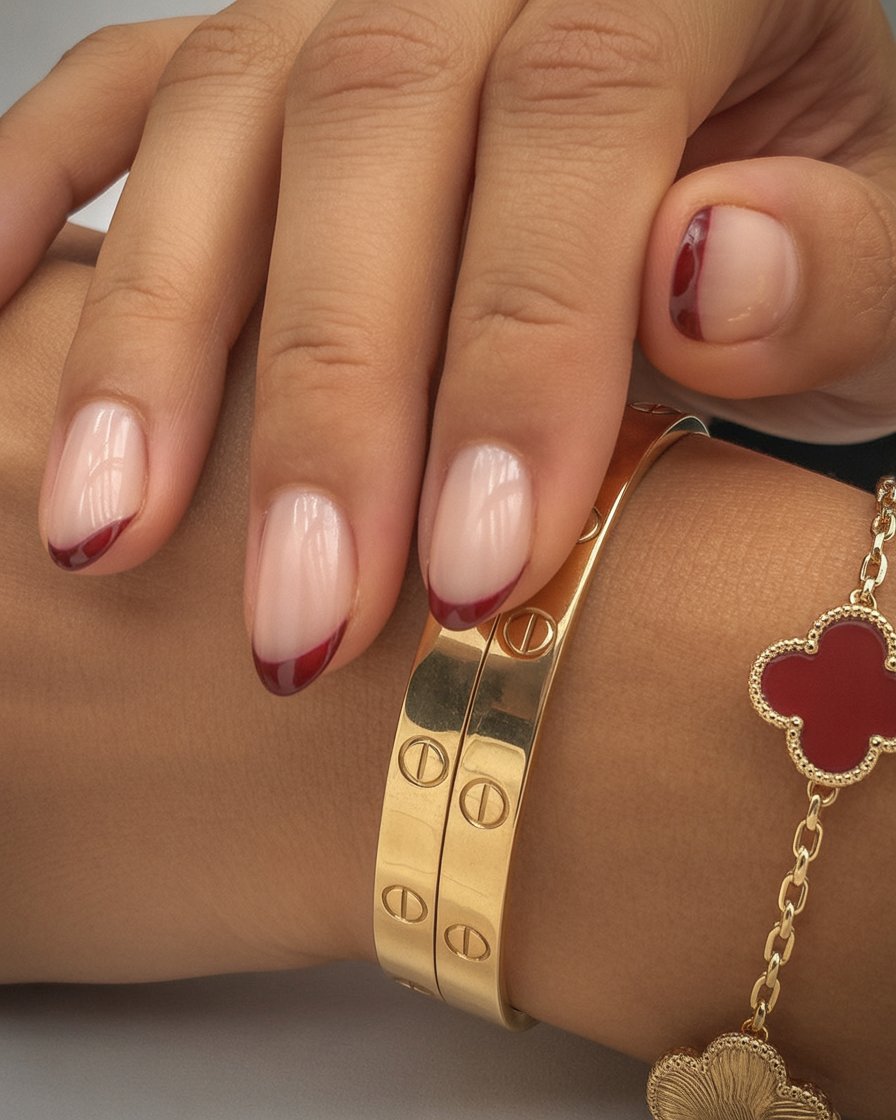 What makes this cut special or unique: shifting the line inward creates a slimmer tip and elongates the nail, even on medium lengths. Ask for a soft nude base, then a thin contour of red using a liner brush. Seal with a glassy builder top so the curve looks 3D. Minimal regrowth means easy maintenance, and the look pairs beautifully with blue denim, white tees, and gold rings.