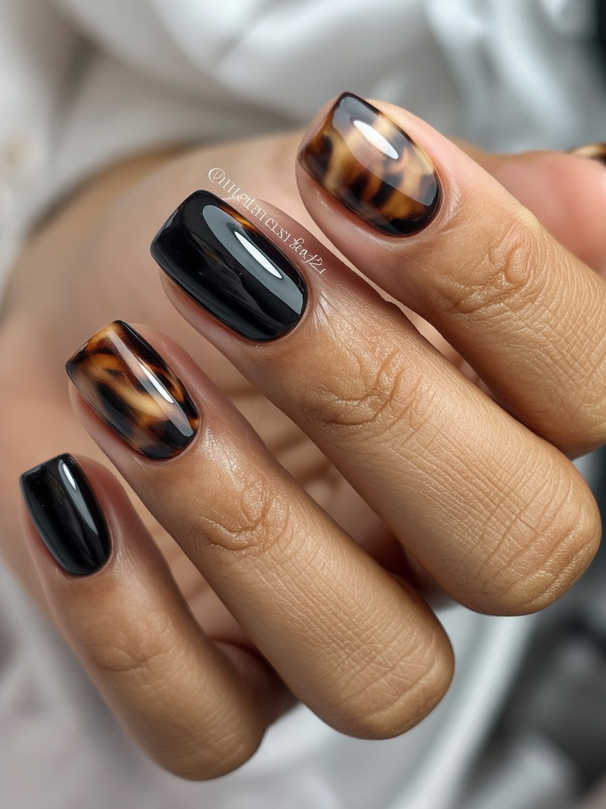 This manicure pairs inky black gel with warm tortoiseshell panels, like a chic trench over a little black dress. The contrast is graphic but still classy, giving short square nails a couture feel. High shine makes the colors look deeper and more dimensional—perfect for fall dinners, winter parties, and every coffee run in between. It’s timeless with a tiny wink, exactly the kind of art design that never fights your outfit.