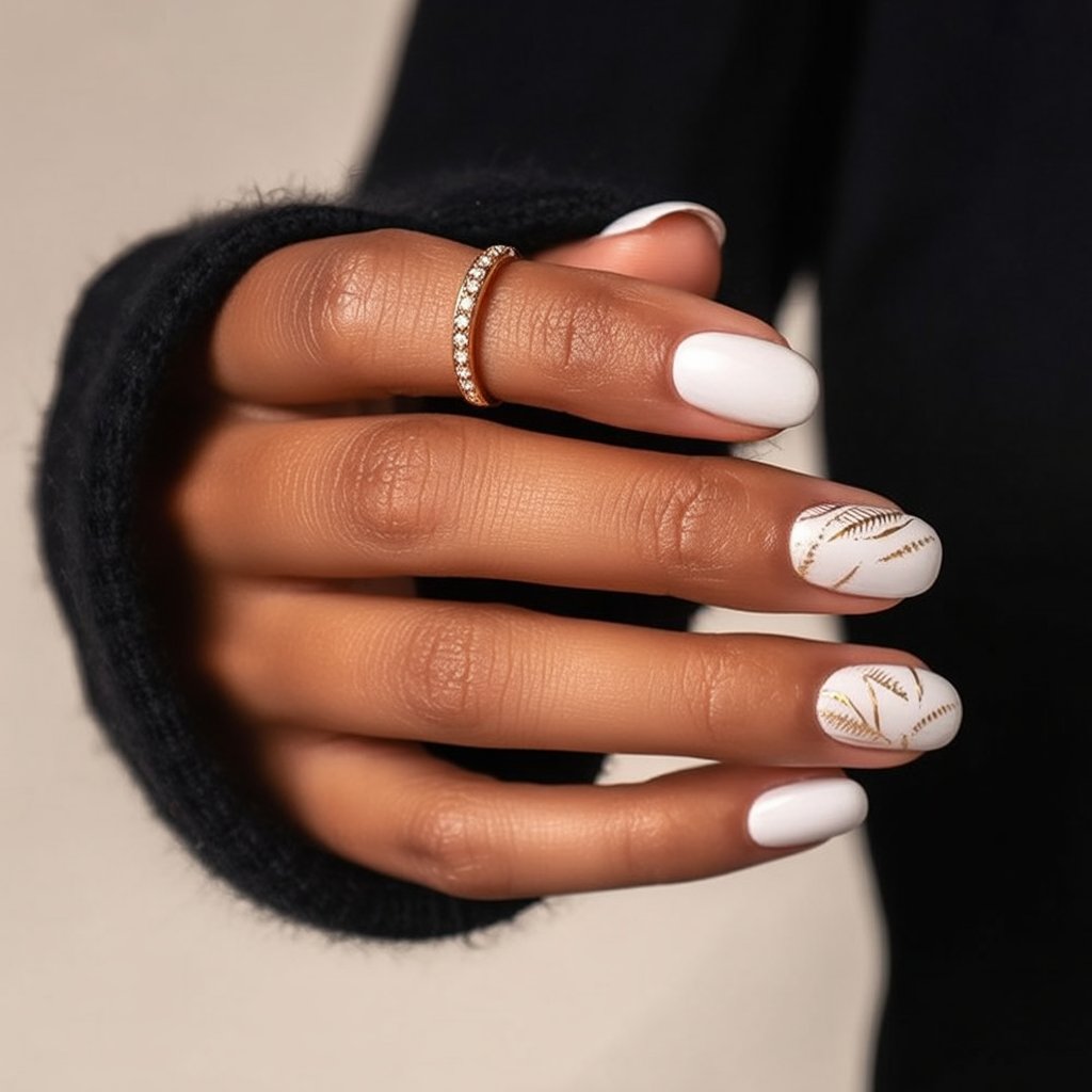 Crisp white gel paired with delicate gold leaf stems feels fresh and minimalist—like a linen shirt and a delicate chain. The tiny botanical lines soften the stark white, turning a simple base into refined art. It’s bright in summer, elegant in winter, and perfect when you want your nails to whisper rather than shout. The overall look is calm, balanced, and quietly glamorous.