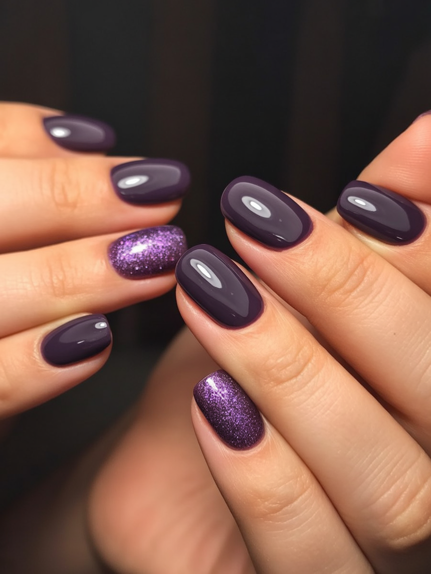 A moody plum gel instantly reads sophisticated—think candlelight, a knit sweater, and your favorite gold hoops. Most nails are drenched in a glassy finish that looks almost liquid, while one shimmering accent brings just enough sparkle to feel festive without tipping into party-only territory. The rich tone flatters every hand, making skin look creamy and warm, and the rounded shape keeps the silhouette soft and pretty. It’s a chic go-to for fall dinners, holiday gatherings, and that power presentation when you want polish with quiet confidence.