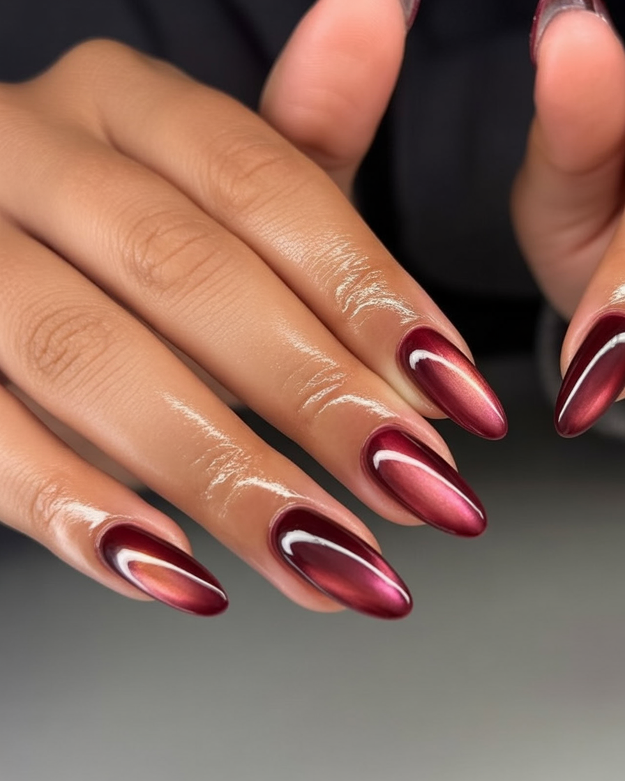 A deep, ruby gel with magnetic cat-eye shimmer flows through the center like silk in motion. It’s rich and dramatic. Perfect for dinners, holiday parties, or whenever you want your nails to serve as an accessory. It’s a modern classic that you will bookmark for fall.