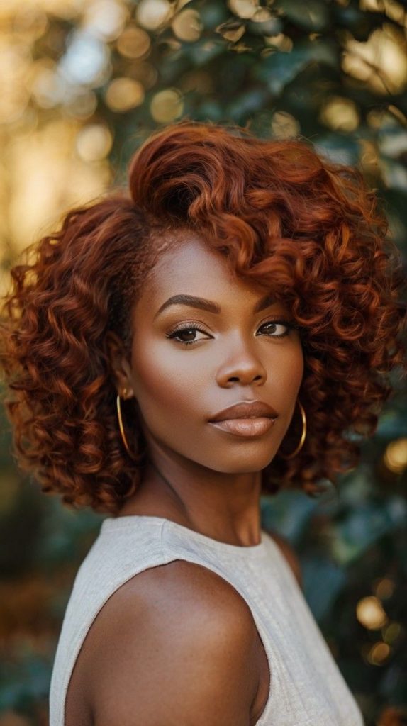A modern short cut, this textured bob features warm ginger highlights that beautifully frame the face. Ideal for women with natural curly hair, the asymmetrical waves give a chic yet effortless vibe. This hairstyle pairs perfectly with off-the-shoulder tops, highlighting the neckline and adding an elegant touch to any outfit.