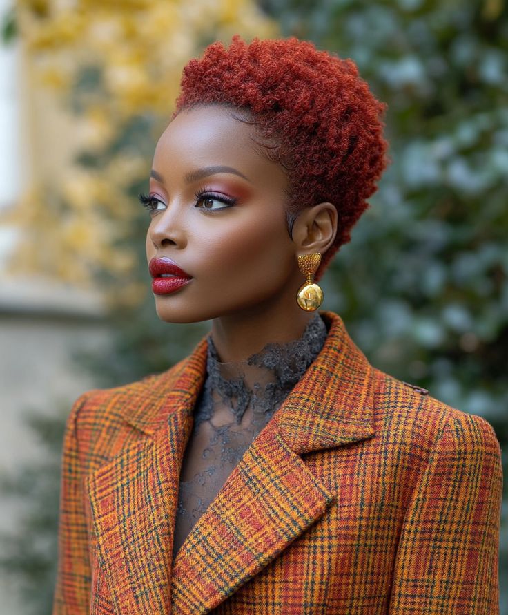 A tapered afro with a ginger hue delivers a confident, chic vibe. This natural 4c hairstyle works best for women who embrace their natural texture and love statement-making colors. Pair it with tailored coats in bold patterns, as shown, for a high-fashion edge.