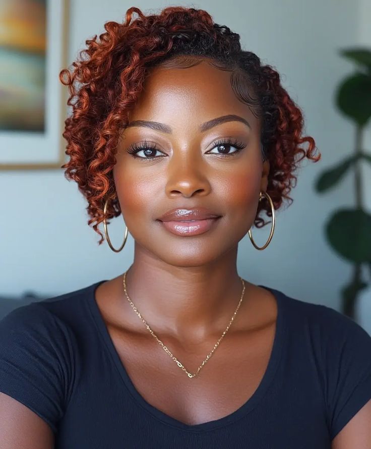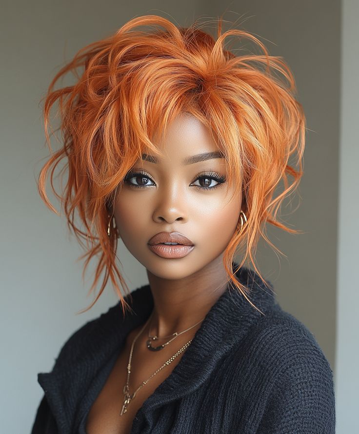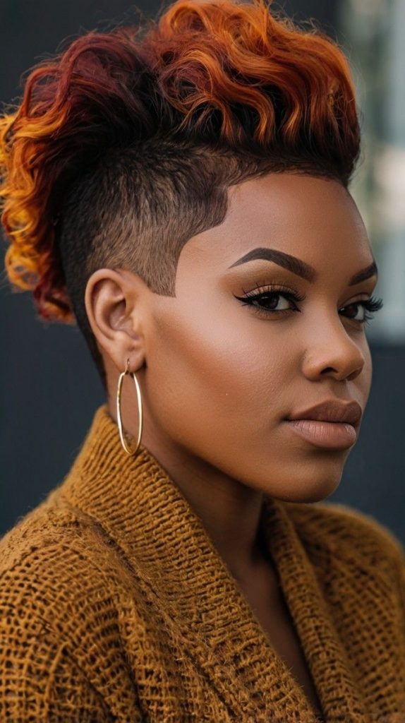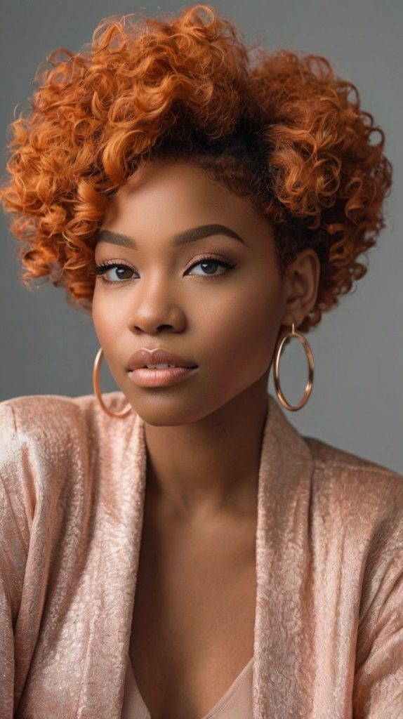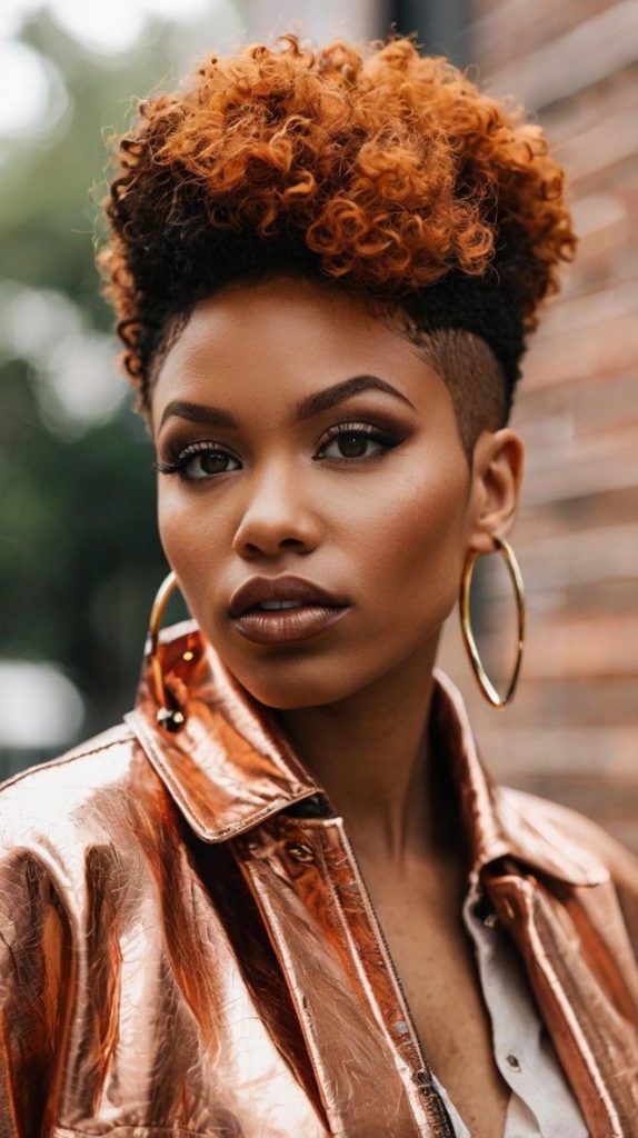 This dramatic short cut features a high-contrast undercut paired with vibrant ginger curls on top. Ideal for black women who love bold and modern styles, this look pairs wonderfully with statement earrings and edgy streetwear outfits.