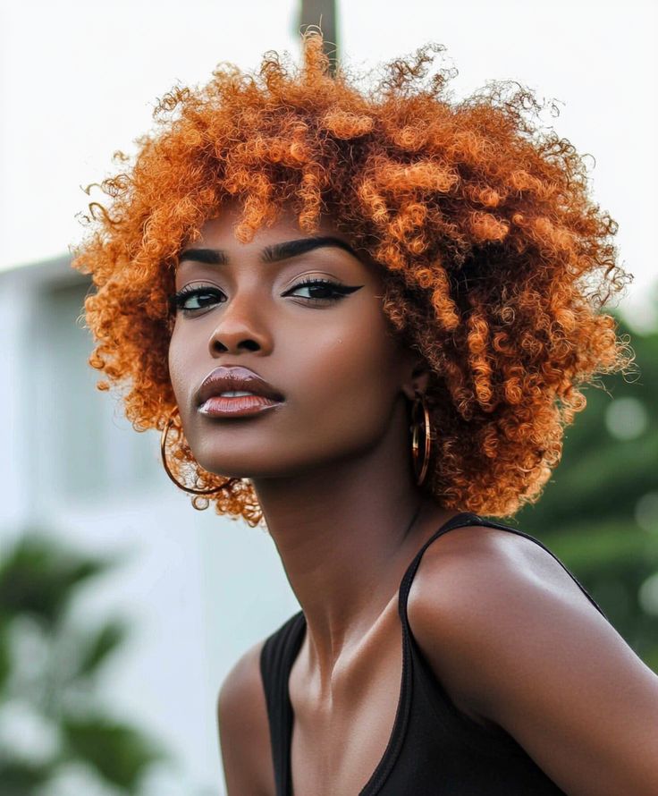 The full, textured afro embraces natural hair while showcasing ginger tones that pop against dark skin. This bold look pairs effortlessly with a black sleeveless top or edgy, monochromatic outfits.
