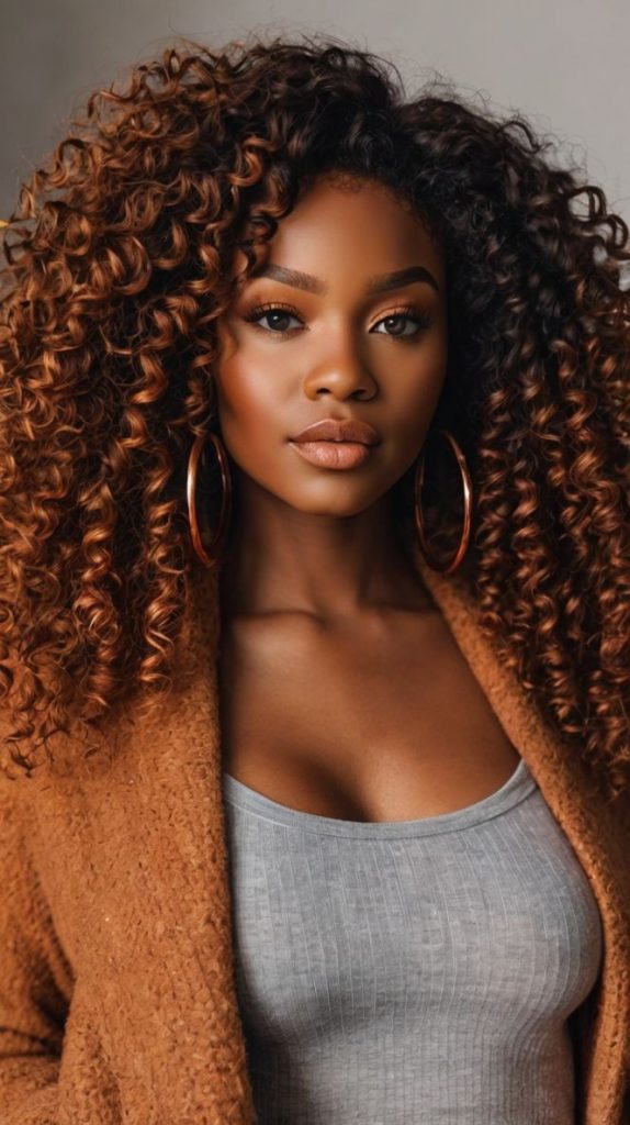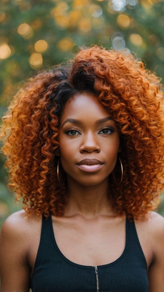 These cascading ginger curls celebrate natural 4c hair with vibrant color and volume. The warmth of the ginger tones adds dimension, complementing dark skin tones effortlessly. Styled for maximum volume, this look pairs well with cozy fall layers like a camel cardigan or a chic trench coat.