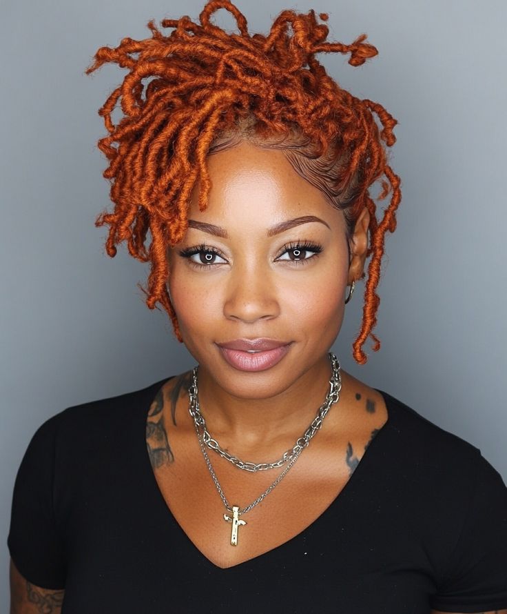 Vibrant ginger locs styled in a playful updo exude personality and creativity. These hairstyles are perfect for women who embrace bold colors and unique styling. Pair the locs with black tops and layered necklaces for a striking contrast.
