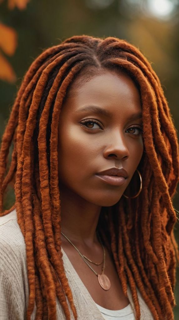 These free-flowing ginger locs bring a bohemian edge to any outfit. They pair beautifully with flowy dresses or boho-inspired cardigans, making them ideal for outdoor festivals or cozy autumn outings.