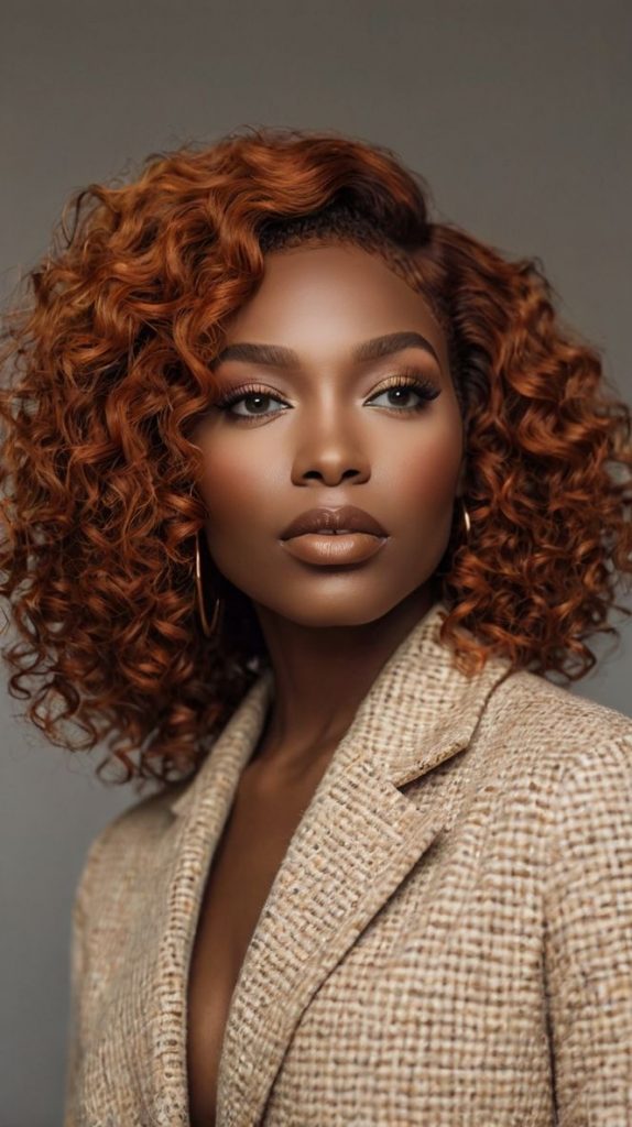 This lob (long bob) combines the sophistication of defined curls with warm ginger hues. A side part enhances the layers, creating an elegant look that transitions seamlessly from day to night. This hairstyle works best with structured blazers or tailored dresses, perfect for professional settings.
