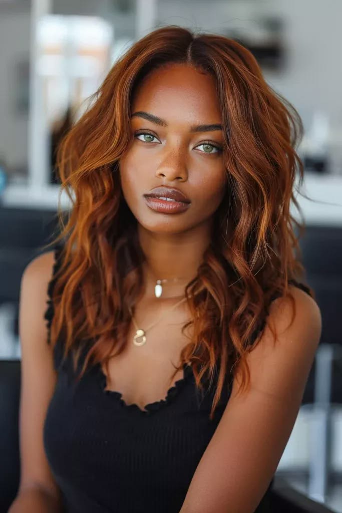 Soft ginger waves add subtle charm to medium-length hair. This look emphasizes natural textures, making it perfect for everyday wear. Paired with a minimalistic outfit like a fitted black dress or neutral-toned jumpsuit, this hairstyle radiates understated elegance.