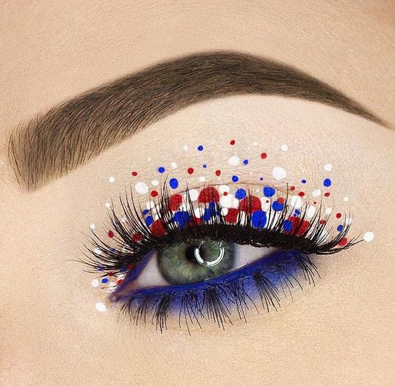 This look takes a whimsical approach with polka dots scattered across the eyelid, reminiscent of fireworks bursting in the sky. It’s a creative take that might inspire someone looking for 4th of July makeup eyeshadow glitter without the usual shimmer.