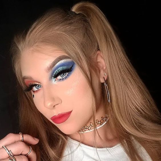 Here we have a playful pop of patriotism. Vivid colors combined with an exaggerated wing create a dynamic effect. It’s a 4th of July makeup eyeshadow easy look that’s fun and perfect for a festive barbecue or an evening of fireworks.