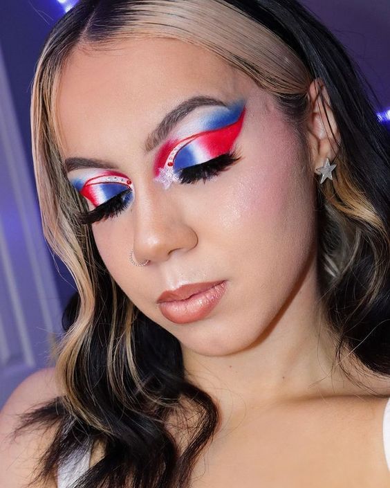 For the makeup enthusiast who adores bold lines and sharp contrasts, this graphic eyeshadow design is a work of art. It features sharp angles and clean lines, marrying the colors of the flag with a modern twist. This look would be great for someone searching for 4th of July makeup eyeshadow ideas that stand out in a crowd.