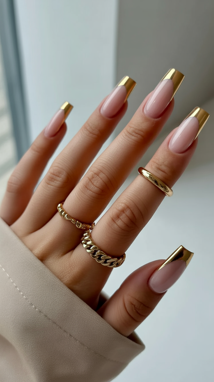 A crisp square shape meets a bold, brushed-gold tip—clean, architectural, and very modern. The nude base reads polished, while the metallic edge gives “editor-off-duty” energy. Think of it as jewelry for your fingertips. Styling tips or care instructions: Ask for a sheer gel base to blur ridges, then a chrome or foil tip sealed with two layers of topcoat. It pairs perfectly with colors that look good with gold—black tailoring, white shirting, and deep wine and lipstick for night. Keep cuticles hydrated so the metal edge stays the star.