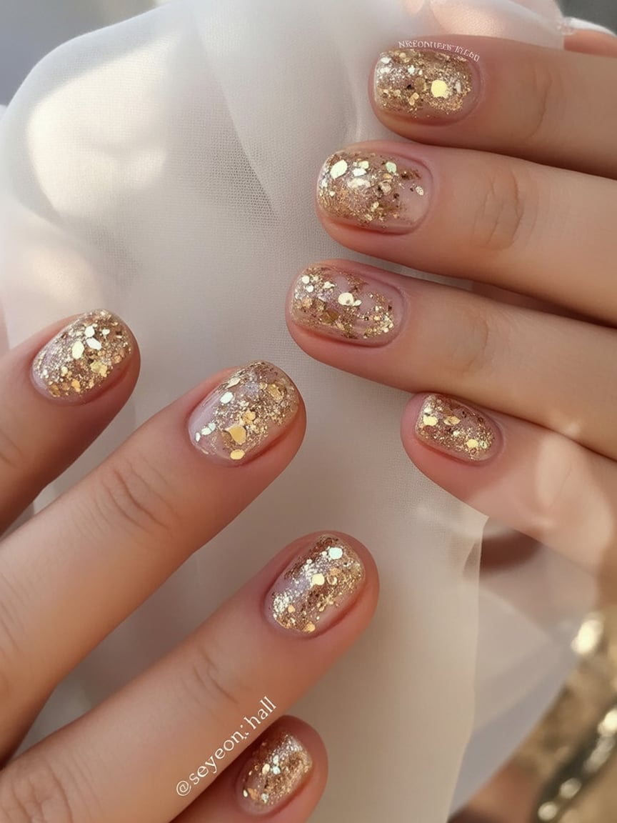 A sheer nude base melts into burnished gold, like sunset easing into evening. The gradient adds length and elegance without heavy sparkle, keeping the mood romantic and wearable. It’s a perfect pick for weddings, holidays, or any moment that deserves a little glow without the fuss. What to wear it with: pair with delicate earrings, a soft rose lip, and a slip dress—or go casual with denim and a cream knit. These tones are the definition of colors that go with everything: jade and emerald, white and ivory, and even red and brick for contrast. Request gel to keep the ombre crisp, or a long-wear polish if you swap ideas often.