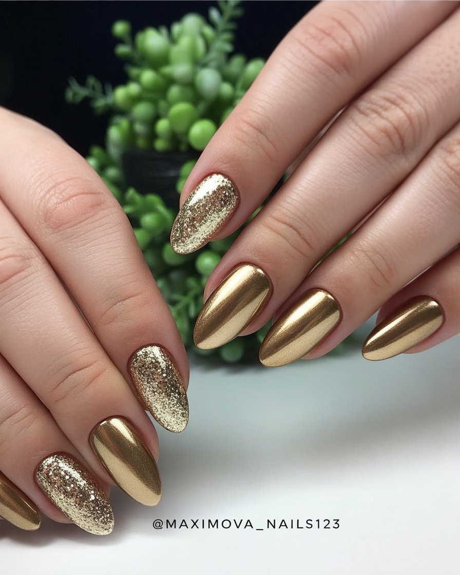 Why settle? Sleek chrome nails alternate with full glitter—texture, shine, and movement in one cohesive palette. The mix feels festive without losing sophistication. Low-maintenance angle: the glitter nails disguise wear, while the chrome holds up beautifully under a durable gel topcoat. If you want toenails colored black, the gold brings balance so fingers and toes still read as a set. Touch up with a shimmer polish between appointments to refresh the sparkle.