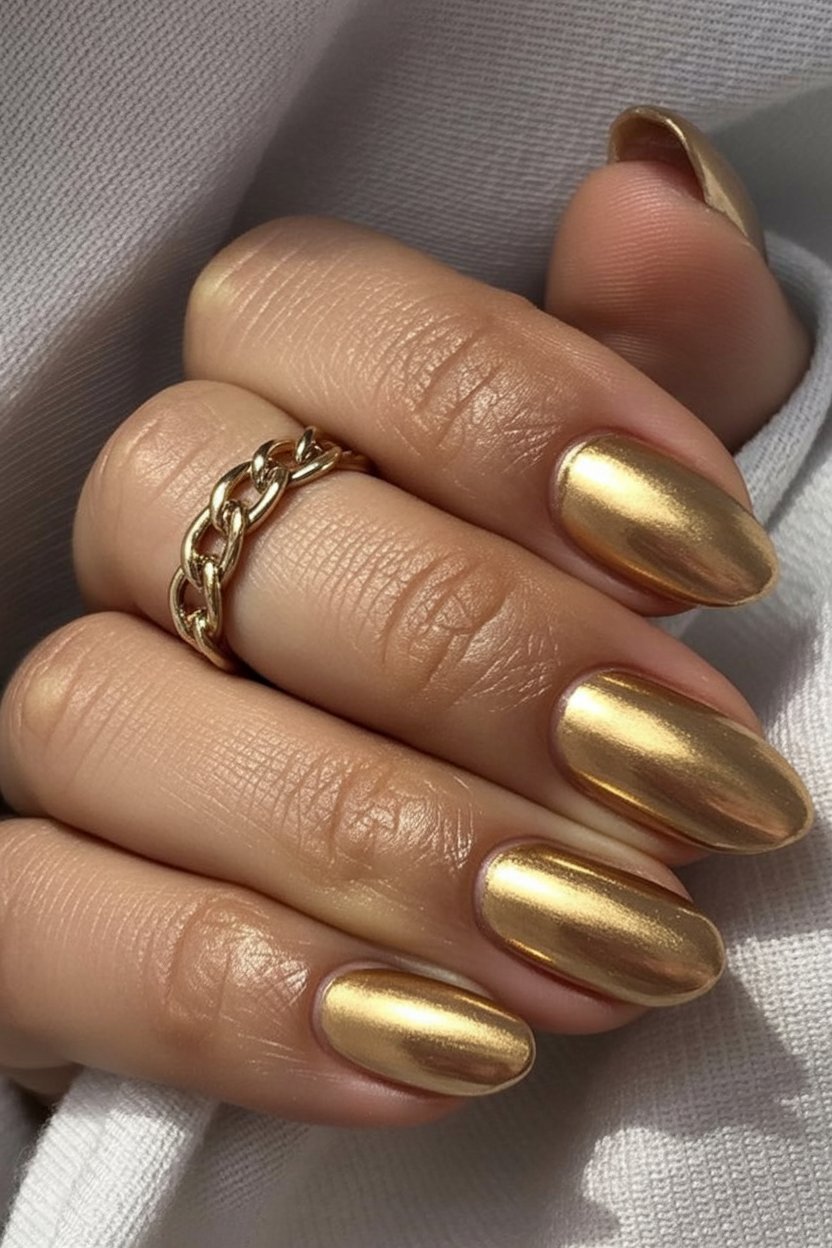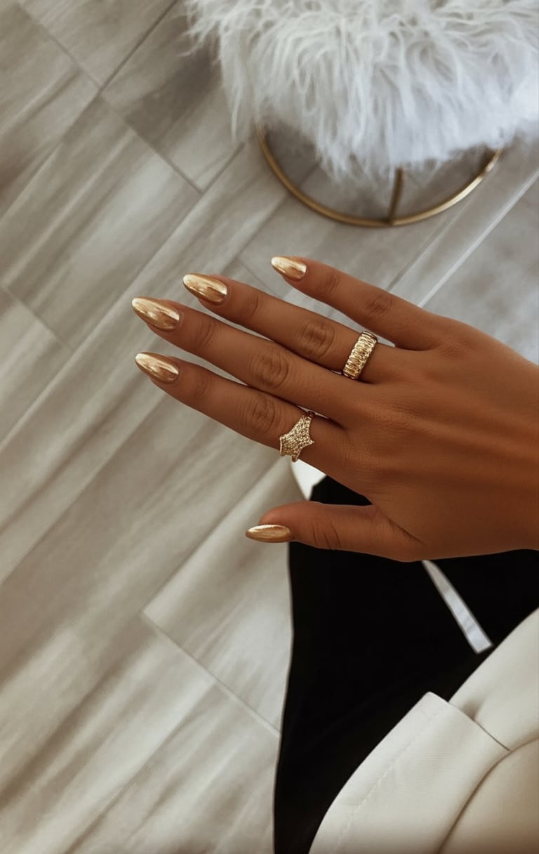 Softer than mirror chrome yet richer than basic shimmer, this satin-finish gold looks like morning light on silk. It’s elegant, grown-up, and quietly confident—the manicure version of your favorite cashmere wrap. The oval shape keeps it timeless and flattering, making every ring stack feel deliberate. Emotional payoff: if you’re craving a reset, this set delivers instant polish with almost no effort. Choose Gel to hold that velvety glow for weeks. For toes, choose colors that go with warm metallics—champagne or brown and caramel—so your pedicure harmonizes without matching exactly. Add a rose lip and delicate hoops to complete the glow.
