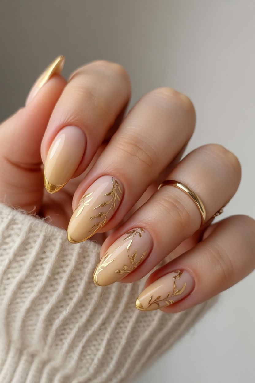 For this, ask your tech for a sheer nude Gel to smooth your canvas, then a brushed-gold polish for the micro-French. Leaves can be hand-painted or stamped and sealed with a glossy top for two weeks of wear. For your outfits, stick with colors that warm up to metallics with white and cream, brown and camel, or a deep wine and lip. For a polished match, pick Champagne for your coordinating toenails. The look can also play with red and accessories for even bolder evening ideas.