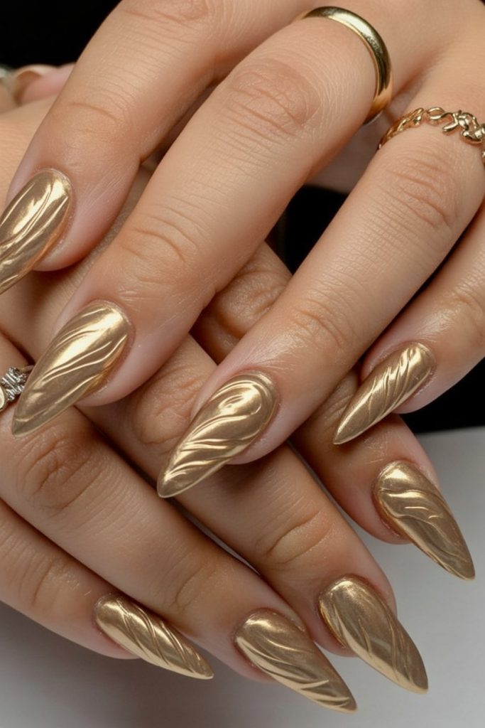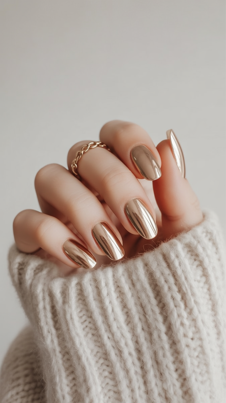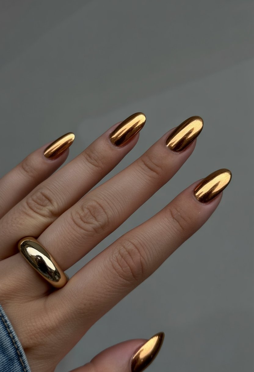 These reflective beauties look like liquid metal poured over each nail—sleek, futuristic, and unapologetically luxe. The mirror finish delivers new-season energy and photographs like a dream. If you’ve been craving a bolder mood for 2026, this molten gold is your golden ticket, striking on its own and even better stacked with rings. Current trends (especially in 2026): chromes stay strong, shifting toward jewelry-inspired tones that feel day-to-night. For best results, apply a no-wipe top, buff on chrome powder for that high-beam reflection, then seal with two topcoats to protect the sheen. The color plays nicely with black tailoring, cream knits, and other colors and neutrals that go with warm gold.